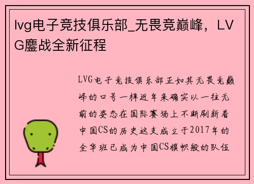 LVG电子竞技俱乐部正如其“无畏竞巅峰”的口号一样,近年来确实以一往无前的姿态,在国际赛场上不断刷新着中国CS的历史。这支成立于2017年的全华班,已成为中国CS旗帜般的队伍。 下面这个表格整理了LV...